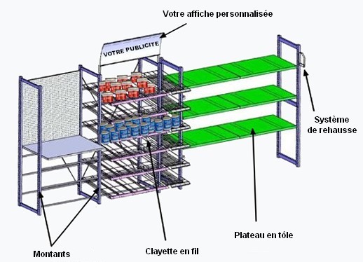 L’inclinaison des plateaux permet d’obtenir une avance automatique des produits qui se retrouvent ainsi en position pour être vus et achetés. Ce système vous permet aussi d’éviter les contraintes liées au réassort. Ces matériels sont conçus pour attirer le consommateur vers le produit (visibilité à distance) et informer voire stimuler l’achat à travers l’ILV.